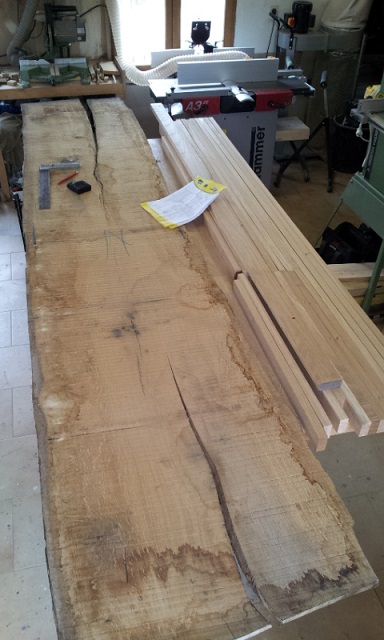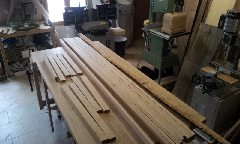 En photos nous allons partir d'un plateau de chêne sur lequel chaque pièce de cette armoire sera successivement traçée, découpée, dégauchie façe et chant, rabotée aux dimentions voulues. Ensuite vient le façonnage des assemblages, tenons et mortaises chevillées pour les traverses et les montants, une feuillure dans laquelle vient s'emboiter les panneaux . Pour fabriquer ces panneaux des planches sont débitées, rabotées, dégauchies et collées entre elles. Une fois le panneau constitué et sec, une plate bande est façonnée sur la périphérie pour amincir les bords du panneau ce qui autorise son emboitement dans le bâti.